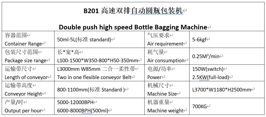 空瓶装袋机至目前为止开发了多种型号半自动,全自动等机型,以适用不同产量,不同瓶型的客户需求。标准型适合产量2000-4000瓶/时,双排,四排瓶适合产量